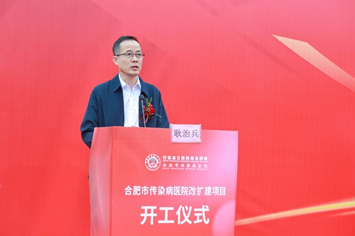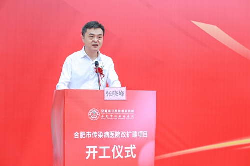 张晓峰书记发表致辞。他指出,合肥市传染病医院作为区域传染病防治中心,在历次疫情防控中发挥了关键作用。此次改扩建项目是落实“人民至上、生命至上”理念的重大决策,将显著改善医院诊疗环境,对提升重大疫情快速响应、集中收治能力具有重要战略意义。